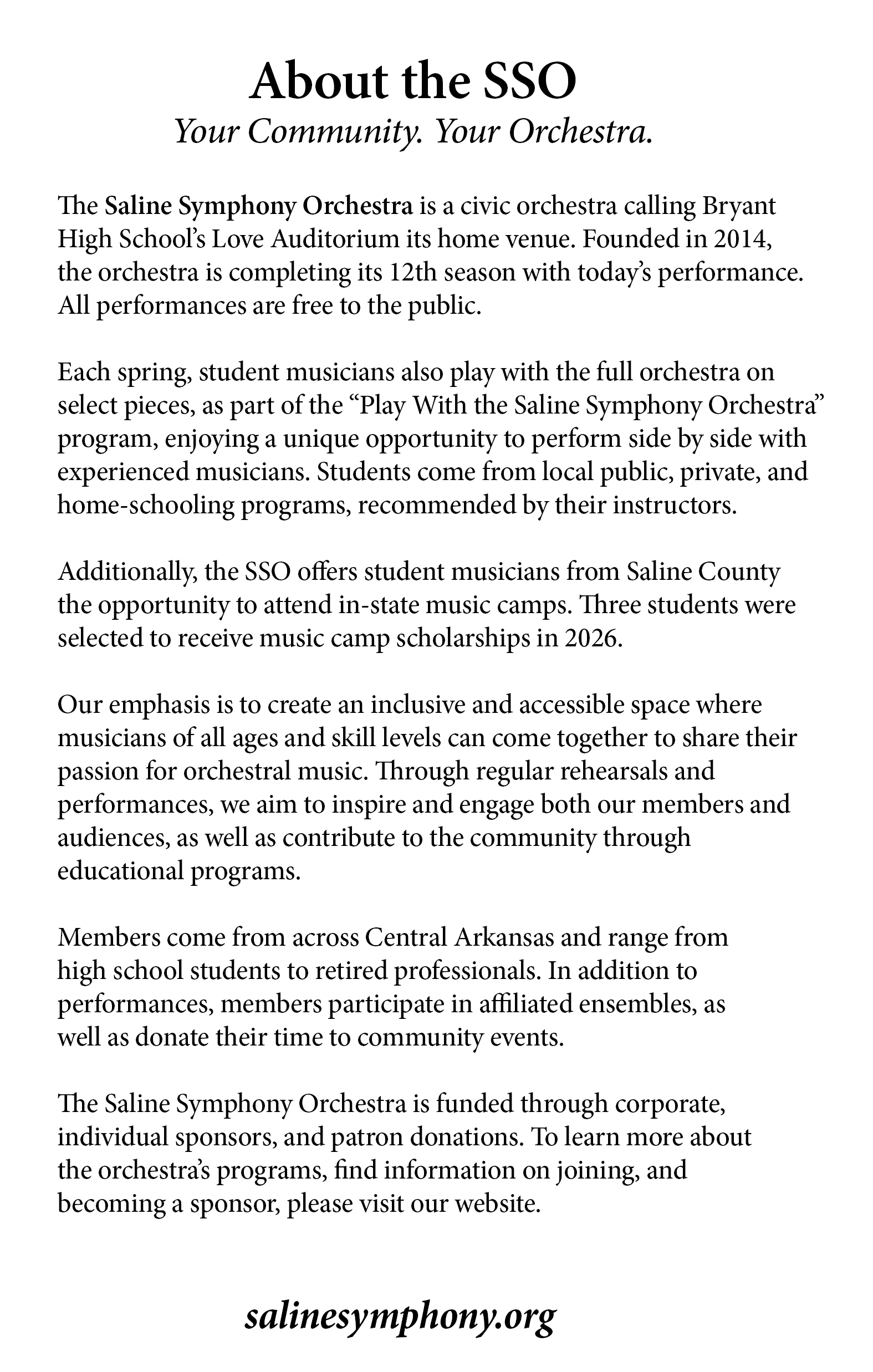 We appreciate donations of all amounts! Donate through PayPal for small donations, or visit our Sponsors Page for larger donations. And thank you for your continued support of the SSO, a 501(c)3 nonprofit serving Central Arkansas.